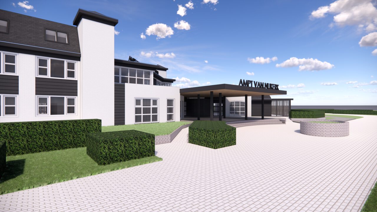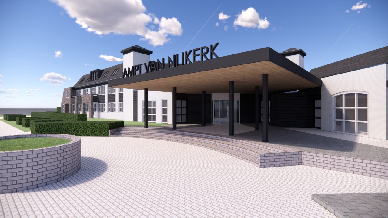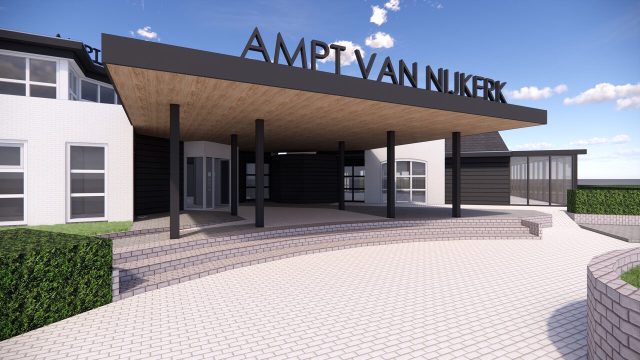 Voor het Ampt van Nijkerk is een nieuwe entree ontworpen. De nieuwe luifel biedt een royaler ontvangst en een ruimere droogloop. Het houten plafond met inbouw verlichting zorgt voor een warm welkom en een geleidelijke overgang van buiten naar binnen. Ook staat de luifel nu haaks op de toegangsweg en sluit deze beter aan op de bestaande trap. De nieuwe signing is nu goed zichtbaar vanaf de doorgaande weg.